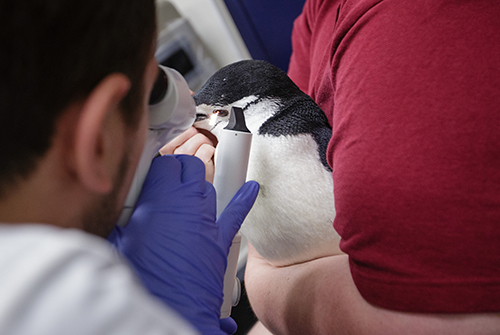 Texas A&M ophthalmologists Erin Scott and Lucien Vallone performed an uncommon cataract surgery to restore vision to a blind chinstrap penguin from Galveston’s Moody Gardens.