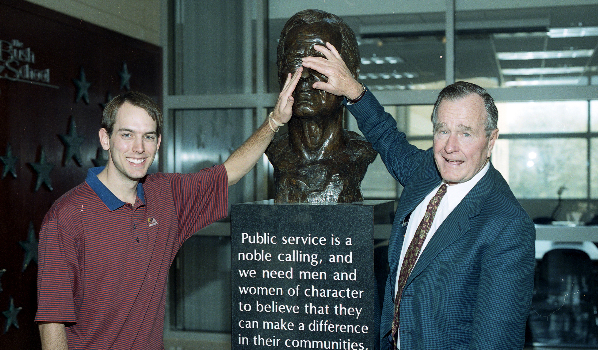 Of course, while academics provide the most essential experience for students at the Bush School, it’s not all work and no play. The school has an important culture—an Aggie one, yes, but also some traditions entirely its own. One of my favorites is the student custom of rubbing President Bush’s bronze bust for good luck on exams, much like the main campus tradition of leaving pennies on Sully’s boots.