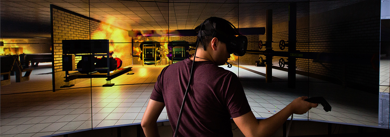 As Yangming Shi ’20, a Ph.D. student in construction science, navigates the underground subway in this virtual world, the crackling sound of fire surrounds him. Smoke impairs his vision. Walking in one direction initiates a massive explosion, while a burst pipe sends water flying in a different corner. The environment is chaotic.
