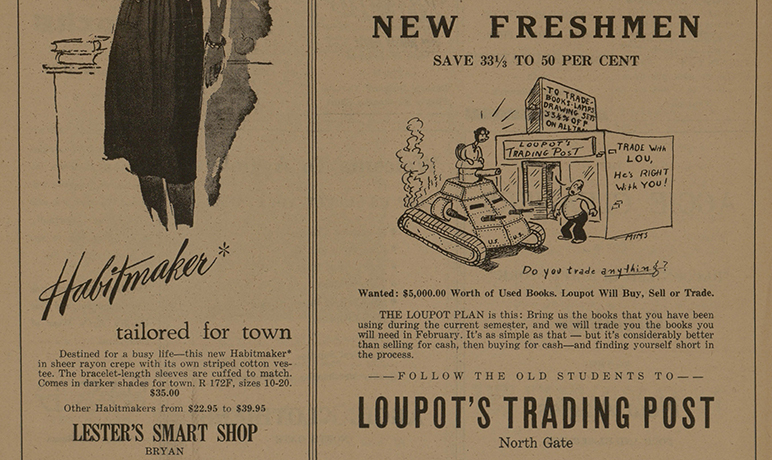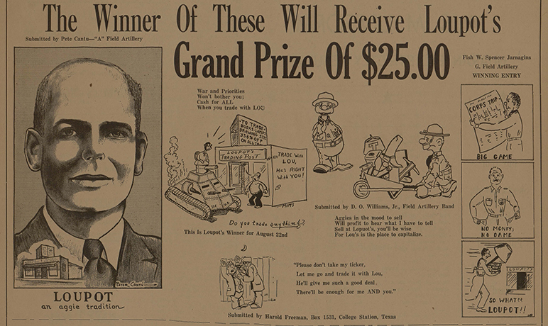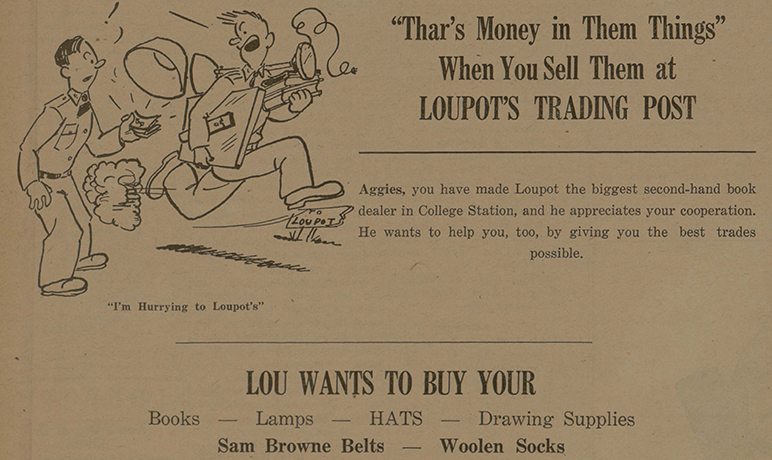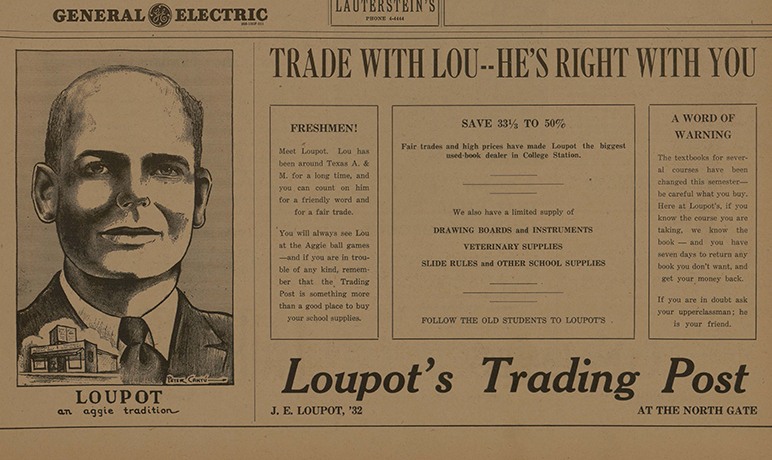 By his junior year, fueled by his passion for people and bargaining, Lou ran a business out of his dorm room with roommate Olin Teague ’32 selling used clothes, books and anything else he could acquire. When a surprise inspection by the Commandant nearly got the pair kicked out of school, friends helped Lou open a warehouse at Northgate. This business eventually evolved into Loupot’s Bookstores, a long-running College Station staple that expanded to three locations before being bought out in 2012.