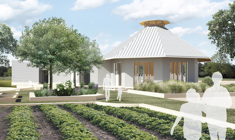As you walk through the vineyard, don’t miss the lively Butterfly and Bee Garden, given by Elizabeth A. ’79 and Gary B. Young ’77, on your left and right. Continue straight until you reach an octagon-shaped pavilion with a design inspired by historic German dance halls and garden gazebos. This iconic structure will host banquets, educational seminars and demonstrations, and other events. Standing in this shady getaway, look around. You’ll see fresh herbs, colorful flora and fauna, an Aggie-centric maroon and white garden, and the Century Oak II, which was planted to continue the legacy of the original Century Tree on main campus.