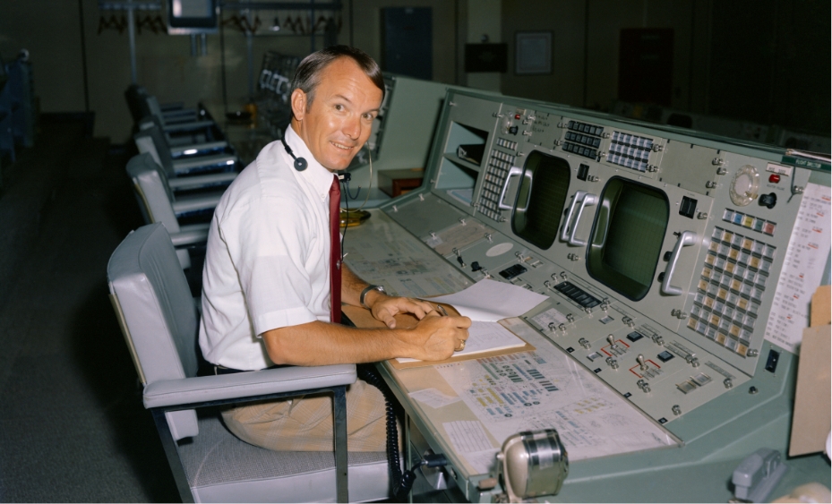 Gerry Griffin ’56 in the flight control room at the Lyndon B. Johnson Space Center in Houston, Texas.