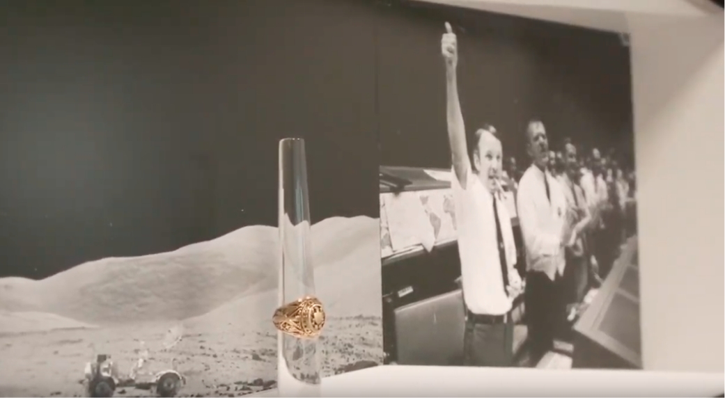 Griffin recently donated that Aggie ring to be displayed in the renovated and expanded Zachry Engineering Education Complex on Texas A&M’s campus. During Apollo 12, the ring was carried to the moon by the astronauts as a favor to Griffin. It is the only Aggie ring that has traveled to the moon (so far). The text above the display asks a daring question: “Where will your Aggie ring take you?”