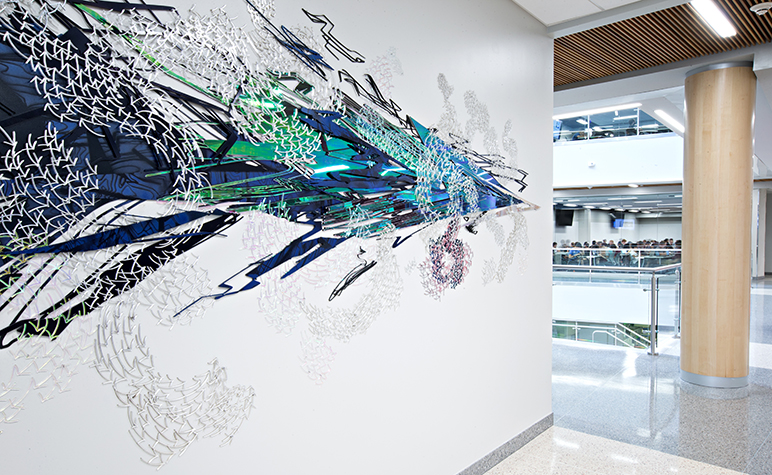 The two artworks live under the names “Shapeshifting to Transcend Limbo” and “Transcending Realms: Chaos and Flow, Love and Fear.” The artist, Lyndi Sales, who hails from Cape Town, South Africa, was one of 10 global artists commissioned to create artwork for display in and around the state-of-the-art engineering complex.