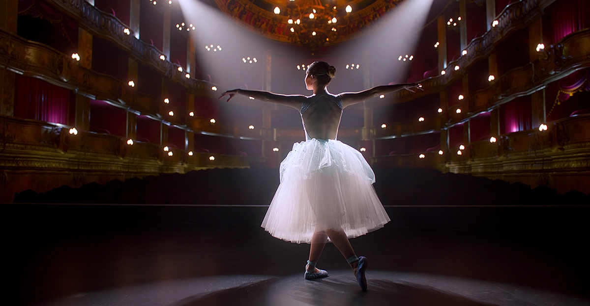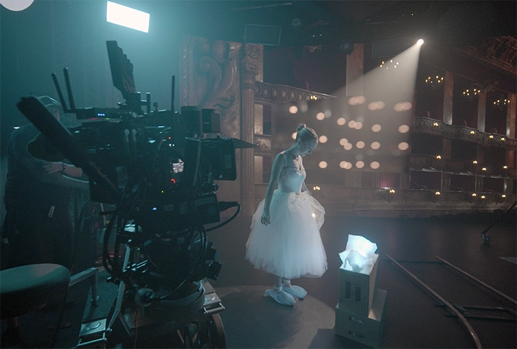 The film, which focuses on a girl working to become a professional ballerina, is a prime example of the industry-shaping combination of art and technology at the heart of the college. Directed by a team of Academy Award- and Emmy-winning filmmakers Brandon Oldenburg and Limbert Fabian and involving students and faculty from multiple PVFA disciplines, the work was filmed almost exclusively on the virtual production stage by combining practical set pieces — like the floor and spotlights in the front-cover scene — with digital creations displayed on massive LED screens — like the theater, seats and chandelier.