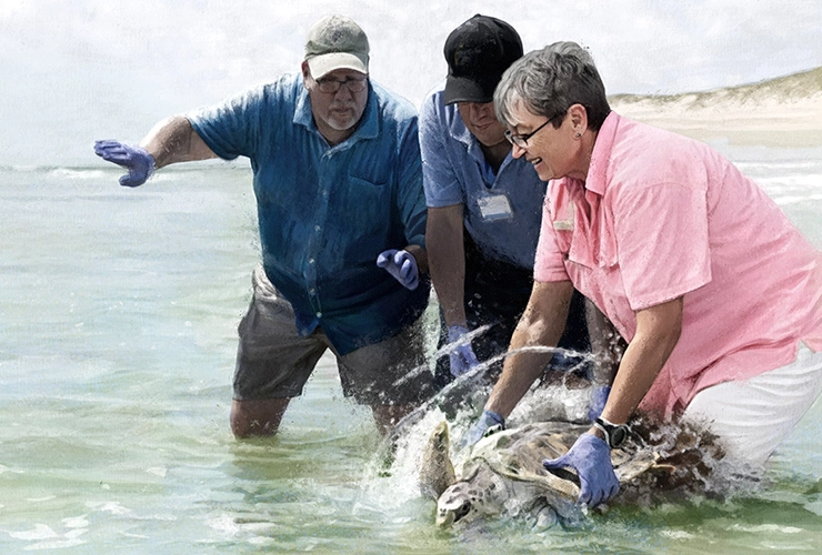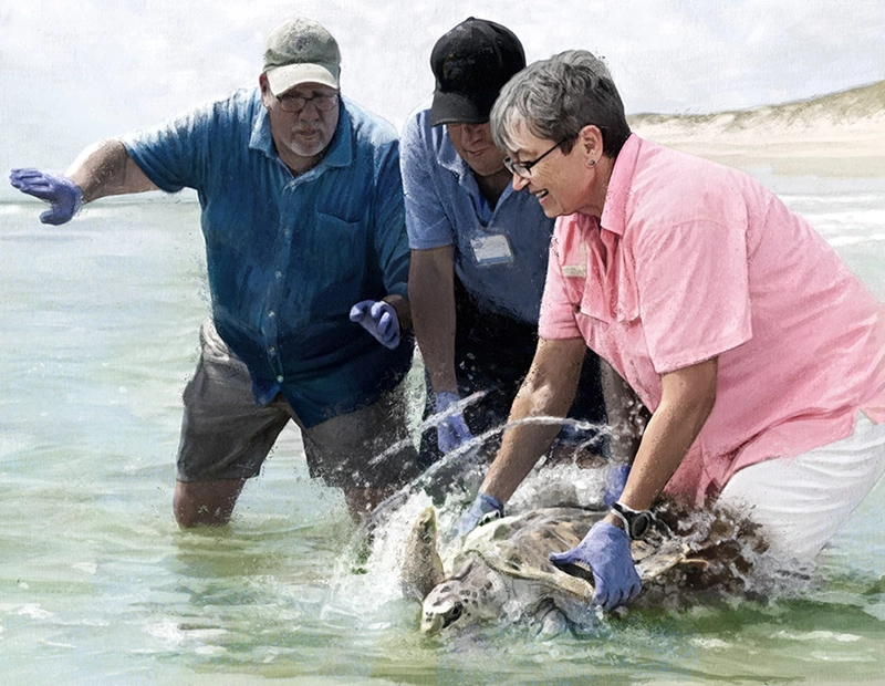 Since getting involved with Texas A&M University at Galveston’s Gulf Center for Sea Turtle Research, Cheryl Mellenthin has attended several Kemp’s ridley releases. (Illustration by Patrick Rosche)