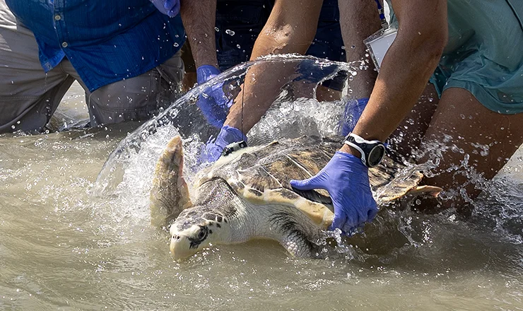 Cheryl Mellenthin waded knee-deep into the warm waves off the Gulf shore near Galveston, Texas, carrying precious cargo: a rehabilitated sea turtle she had named Carrigan, who was ready for release.