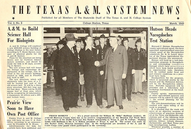 A newspaper clipping documents Bill Huffman ’53 earning a record four-year scholarship to study agriculture in Aggieland (left). He met with Texas A&M University dignitaries following his win (right).