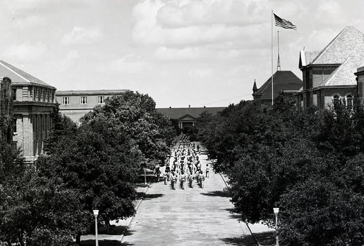 These combined changes had a ripple effect on Military Walk. After Guion Hall — a large auditorium that served as the walk’s southern anchor — was demolished in 1971 to make way for Rudder Tower, university leaders decided to remake Military Walk into a green space with walkways. In the aftermath, its prominence faded, leaving the mature live oak trees lining the thoroughfare as the primary witnesses to its storied past.