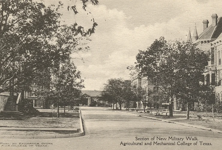As a result, Gates commissioned a study on revitalizing Military Walk that recommended maintaining Giesecke’s design guidelines, preserving historic buildings and features, reinforcing the historical axis crossing of Old Main Drive and creating a sense of arrival at the corridor’s key points. The proposal also envisioned reestablishing the promenade quality through retaining the live oak trees, creating interpretive signage and exhibits at the sites of original buildings, incorporating historic cornerstones and features, and reestablishing campus activities and traditions tied to Military Walk.