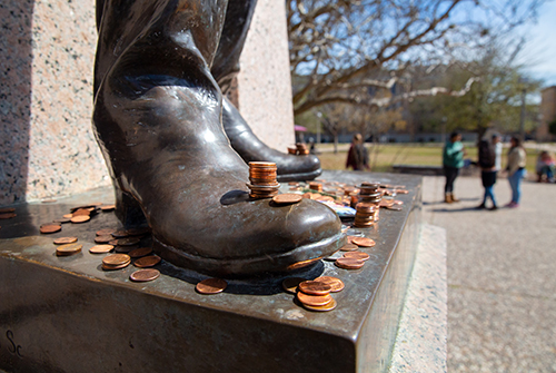 The pennies placed on the statue of Sul Ross currently benefit the 12th Can, an on-campus food pantry.