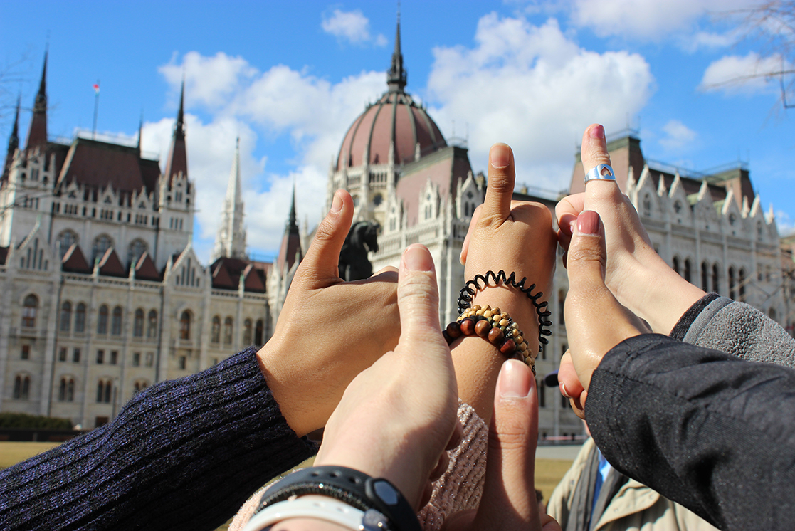 While traveling with the Broad Street Society, a learning community of high-achieving public health students who take honors classes and travel abroad together, Holly Novak ’21 and her friends raised a “Gig ’em” in front of the Hungarian Parliament Building, one of the most historic landmarks in Budapest.