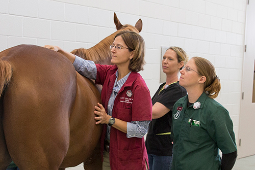 In support of advanced veterinary research, Linda and Dennis Clark ’68 gave a $1 million gift to fund two faculty chairs in the College of Veterinary Medicine & Biomedical Sciences. The faculty chairholders, Dr. Ashlee Watts (pictured in maroon) and Dr. Brian Saunders ’98, are undertaking research in support of the college’s translational medicine priority, which focuses on translating novel treatments in veterinary medicine to the human realm. Saunders is a small animal orthopedic surgeon who runs canine comparative orthopedics and cellular therapeutics laboratories. His team focuses on the development of bone and cartilage tissue engineering solutions and how these solutions can also be applied to humans. Funds from the gift are also supporting Watts, an equine orthopedic surgeon, and her team as they refine the miRNA-29a dose for tendon injury in horses that they developed in 2017. The therapy heals tendon injury faster and better than previous techniques and is undergoing FDA approval. If approved, it will be the first miRNA replacement therapy in the world.