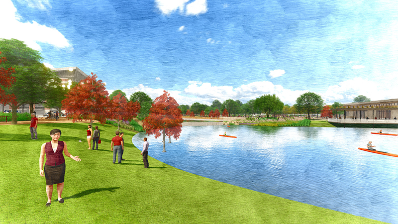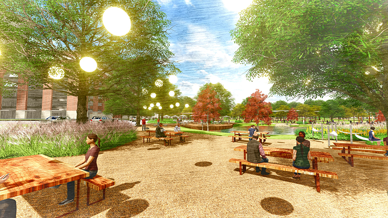Originally conceived as a beautification effort in the form of a lake or water feature adjacent to the Kyle Field renovation, the project has since considered the growing needs of the student body. As a result, Aggie Park will include a lake and outdoor amphitheater for student and public events, additional and enhanced tailgating spaces and green spaces, walking paths and running trails, public Wi-Fi and dedicated media utilities for national broadcasts, and infrastructure improvements. Seating areas will also be integrated throughout, as well as yard games and places to hang hammocks and slack lines.