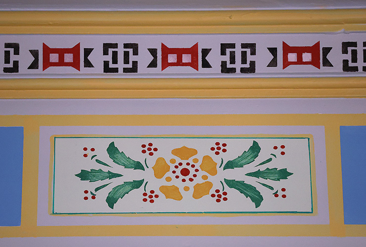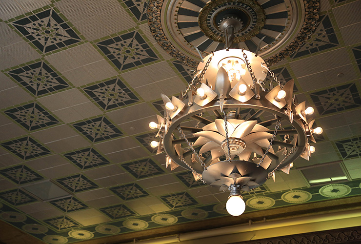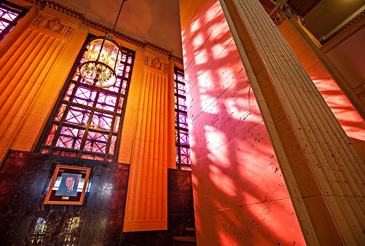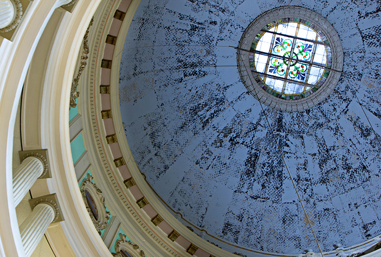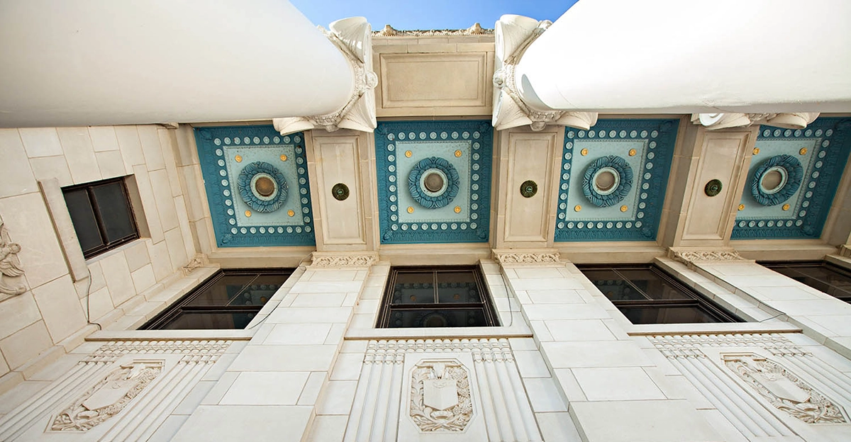 7. This building’s front façade features fourteen Ionic columns adorned with molded tops. Step inside this beaux arts beauty and you’ll find an interior rich with Texas and Southwestern flair that blends ornamental metals, plaster and colorful stained glass like this into a visual feast.