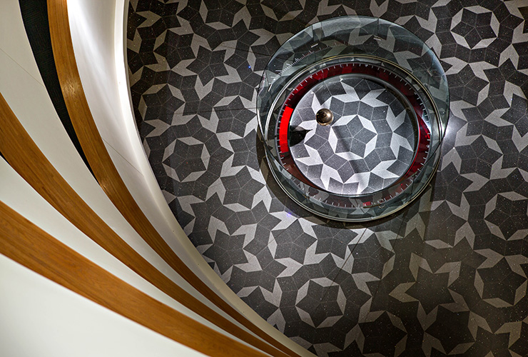 3. This two-building complex is named for two of campus’s most loyal donors. The first building’s lobby houses this suspended Foucault pendulum that swings over intricate Penrose tiling, proving the Earth’s rotation with quiet elegance. Just next door is a rooftop garden where native Texas plants are sustained by a clever rainwater-catching cistern.