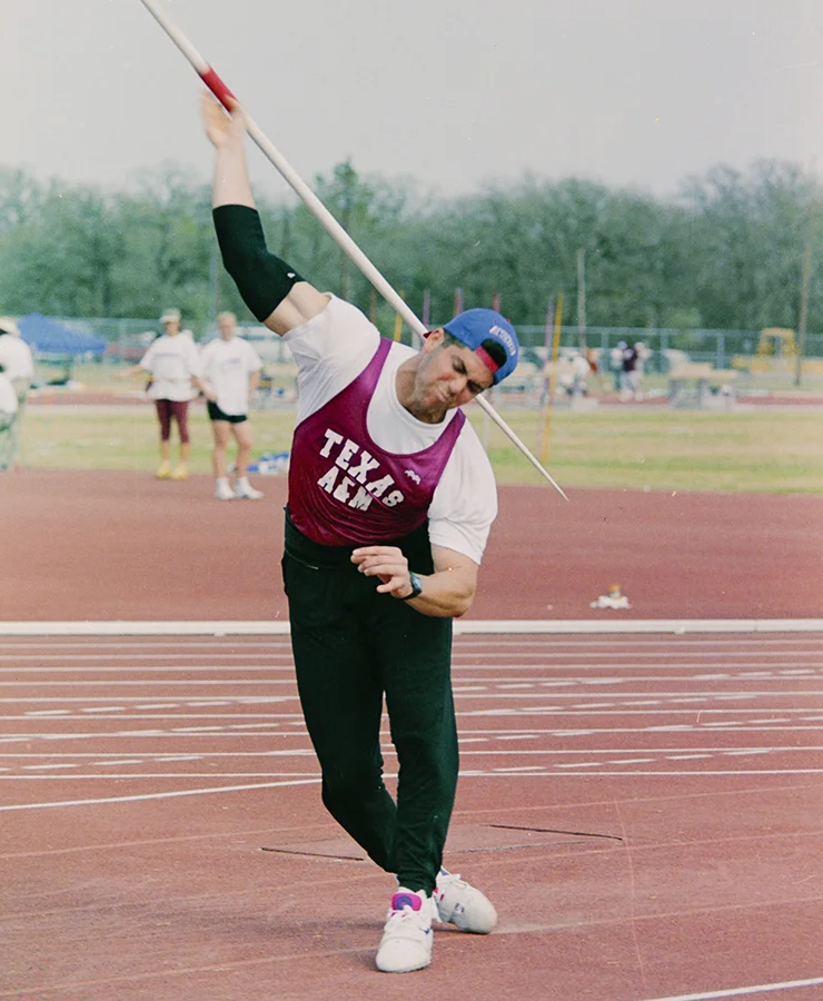 At Texas A&M University, Fernando Palomo ’95 competed on the track and field team and worked toward his own Olympic dreams in the javelin throw. Photo provided by Fernando Palomo ’95.
