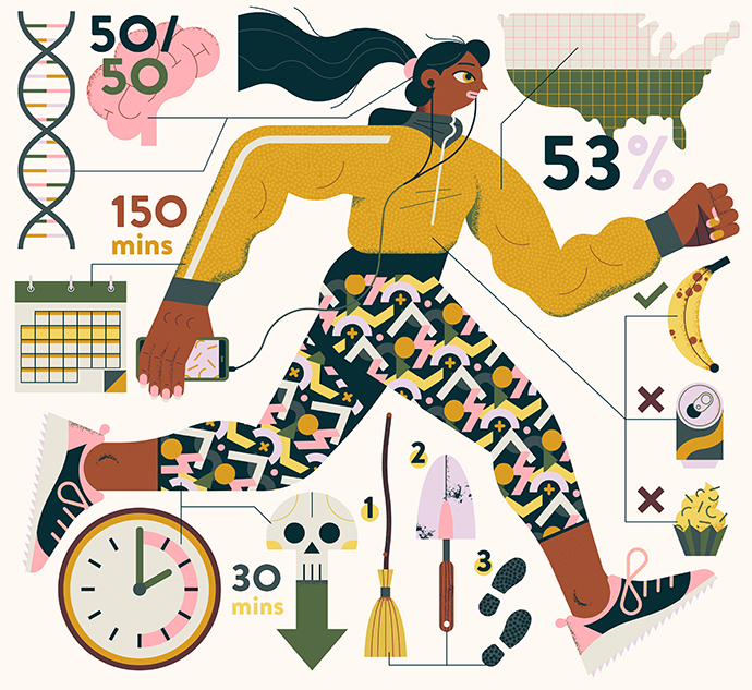 If you’re generally inactive, aiming for 150 minutes of activity per week is a good goal. As you become more active, you can delve deeper into what is best for your health. In general, the best type of exercise is the one you’ll keep doing. No matter your genetic makeup, being physically active for 30 minutes a day can reduce your morbidity and mortality rate dramatically. You can start with activities such as gardening, housework or walking outside.