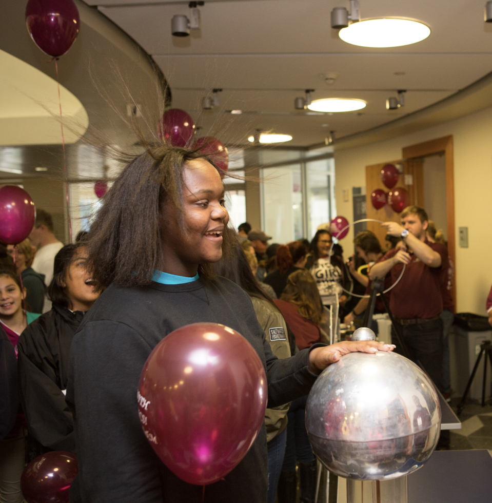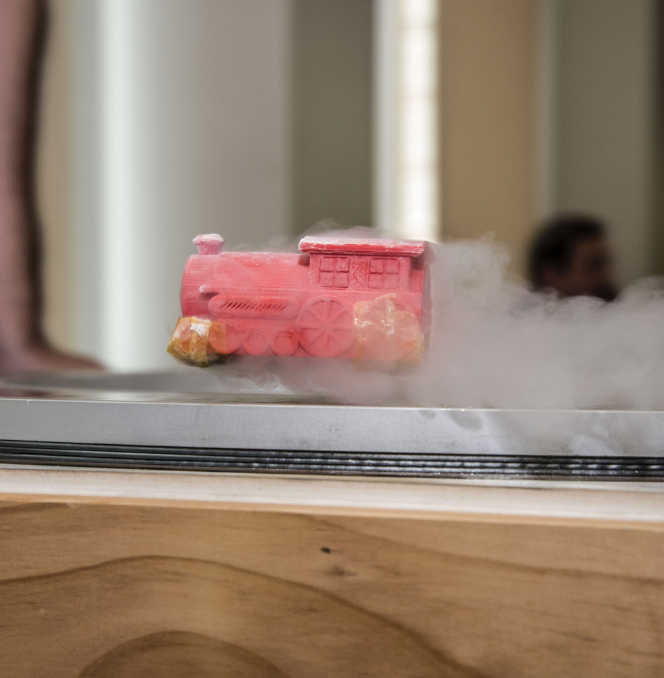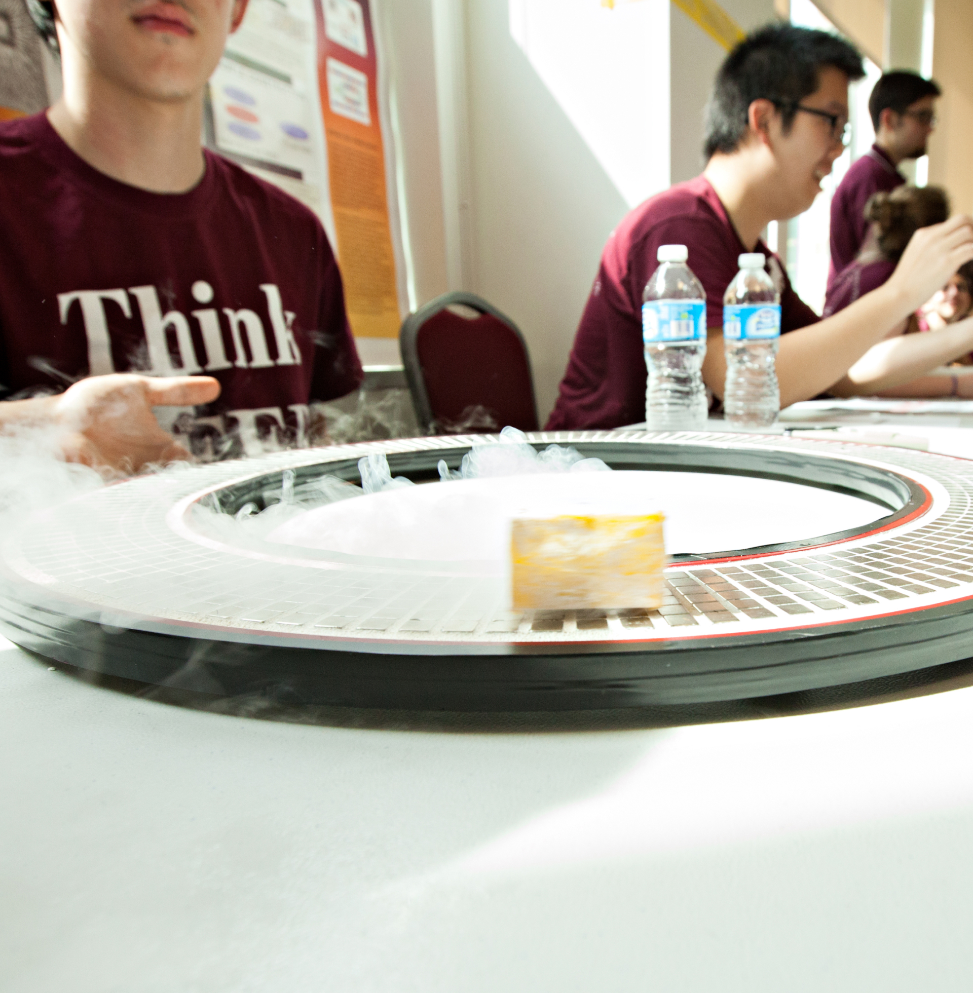 Ever wonder what it would be like if gravity wasn’t dragging you down? Students’ pursuit to answer this question inspired the creation of the Superconducting Levitation demo. Using superconductors cooled to the liquid nitrogen temperature and a magnetic track, the demo exhibits a train that floats above the track due to electric currents circulating in a superconductor. “What seems like a complicated process turns out to be a simple feat of physics,” said Callie Rethman ’20, one of the student demonstrators.