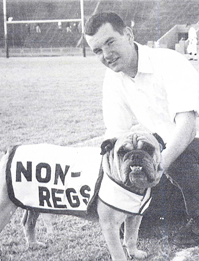 John Choate '67 poses with Ranger I during the annual Corps vs. Civilian football game, during which the bulldog served as the unofficial civilian mascot.